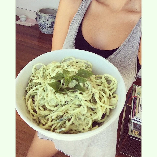 Macarrão vivo (abobrinha crua) no espiralizador, com molho de tofu batido com sal rosa, azeite abacate e manjericão fresco
