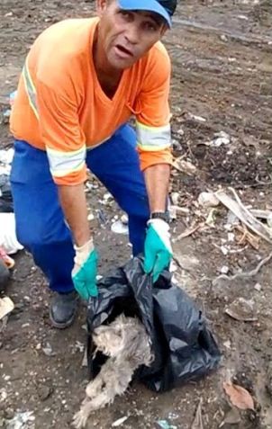 Coletor resgata cachorro em saco de lixo em Lorena