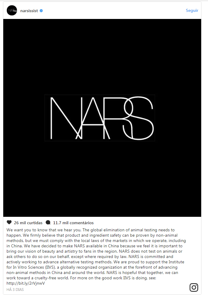 A Nars mantinha a tradição de não o fazer, mas entrar no mercado chinês obriga a respeitar as regras do país. E na China é obrigatório testar produtos em animais antes de os colocar no mercado.